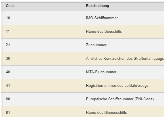 Codes - Beförderungsmittel | ![]() | ![]() |