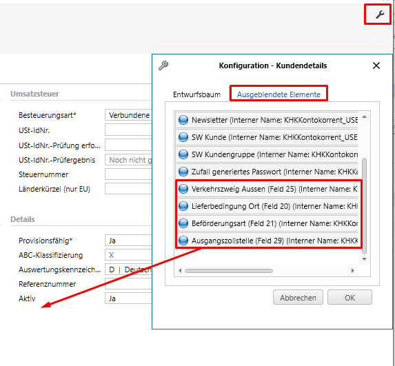 Um die Felder einzublenden, klickt man in dem aktuellen Fenster oben rechts auf das “🔧”- Symbol und auf “Layout des Dialogs ändern“