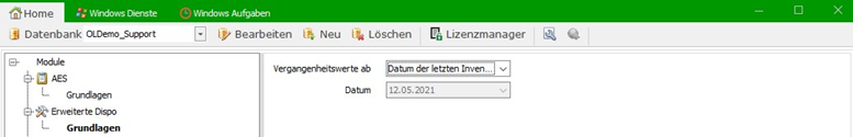 Aus Performance Gründe kann für Journalsätze auf Vergangenheitswerte eingeschränkt werden. Im Softfolio Cockpit können Sie den Zeitpunkt bestimmen, ab wann die Vergangenheitswerte berücksichtigt werden. Gehen Sie hierfür in die Grundlagen bei Erweiterte Dispo. Dann können Sie entweder selbst ein Datum bestimmen, oder das Datum der letzten Inventur verwenden.