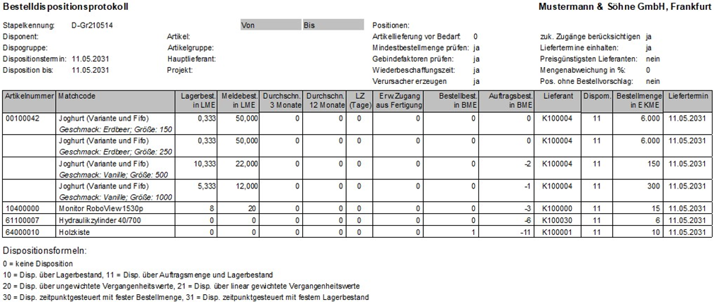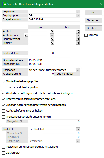 Im Bestelldispositionsprotokoll werden die Auswahlkriterien im Kopfbereich mit ausgedruckt: