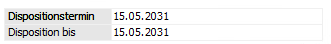 Der Eindeckzeitraum ist das Zeitintervall von „Dispositionstermin“ bis zum Termin „Disposition bis“. Falls beim Artikel im Artikelstamm eine Wiederbeschaffungszeit hinterlegt ist, wird diese Wiederbeschaffungszeit zum Eindeckzeitraum dazugezählt.