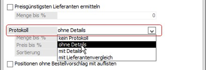 Aufgerufen wird das angepasste Protokoll über die Auswahl im Fenster „Softfolio Bestellvorschläge erstellen“ oder im Fenster „Softfolio Bestelldisposition bearbeiten“ über Optionen / Drucken / Protokoll