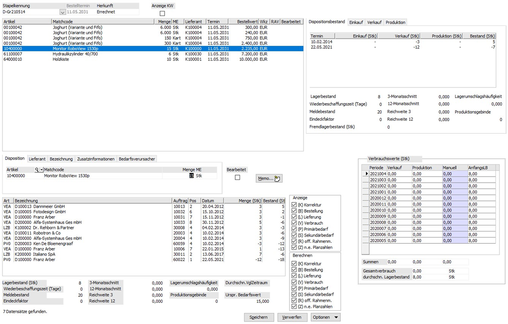 Das Bestelldispositionsprotokoll wurde erweitert und weist zusätzliche Spalten aus: Lagerbestand, Meldebestand, monatlicher Durchschnittsverbrauch (3 / 12 Monate), Wiederbeschaffungszeit (LZ), Erwarteter Zugang aus der Fertigung, Bestellbestand (laufende Bestellungen), Auftragsbestand (Produktion + AB), Lieferant. Diese Liste kann auch an Excel übergeben werden.