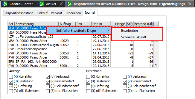 Für Fertigungsartikel und Fertigungsmaterial wird zusätzlich die Information über Fertigungsart, FA-Nr, der Fertigungsartikel und der Verursacher angezeigt. Über die rechte Maustaste kann das Optionsmenü aufgerufen und der Auftrag, die Bestellung oder der Fertigungsauftrag direkt weiterbearbeitet werden.