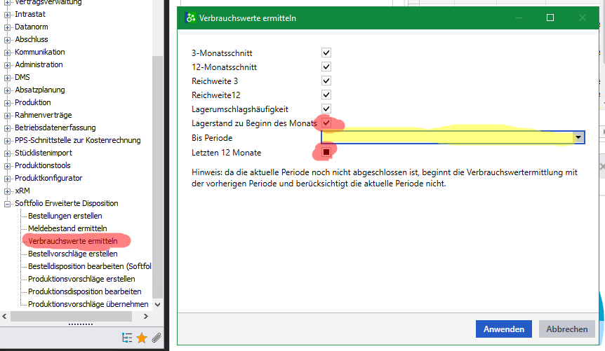 Die Verbrauchswerte (3 / 12 Monatsschnitt, Reichweite 3 / 12, Lagerumschlagshäufigkeit) werden immer vor dem Erzeugen von Bestellvorschlägen für die ausgewählten Artikel aktualisiert, falls für die aktuelle Periode noch keine Verbrauchswerte ermittelt wurden.