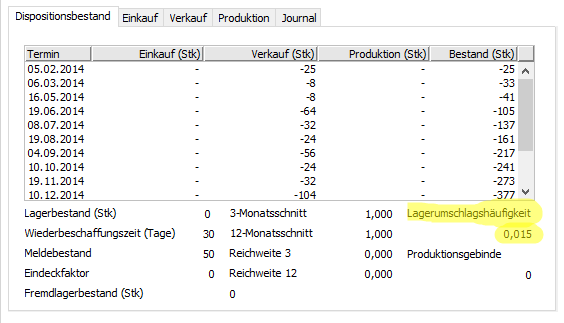 Reichweite 12 | Die Kennzahl gibt den Zeitraum an, in dem der Lagerbestand bei einem durchschnittlichen Materialverbrauch voll ständig aufgebraucht ist. Wird berechnet: aktuellen Lagerbestand / Verbrauch (12-Monatsschnitt) | |
