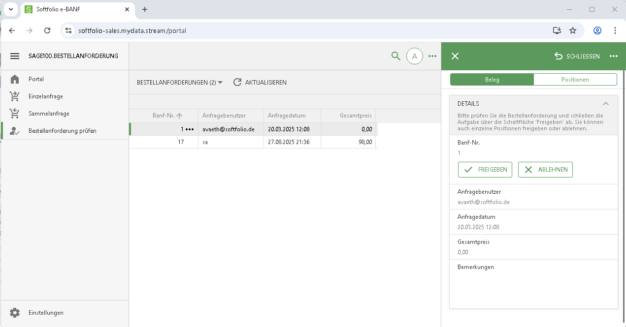 Im Tab Positionen wird eine Liste aller einzelnen Positionen der Anforderung angezeigt. Jede Position kann separat geprüft, freigegeben oder abgelehnt werden.