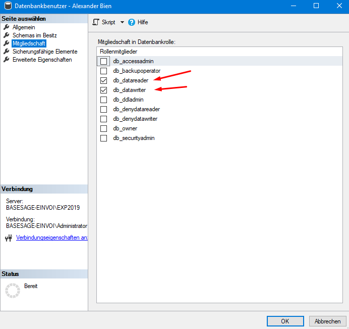 Öffne das SQL Server Management Studio (SSMS) → Klappe die gewünschte Datenbank auf → Sicherheit → Benutzer → führe ein Rechtsklick auf den gewünschten Benutzer aus → Eigenschaften → Mitgliedschaft → Vergebe folgende Berechtigungen: