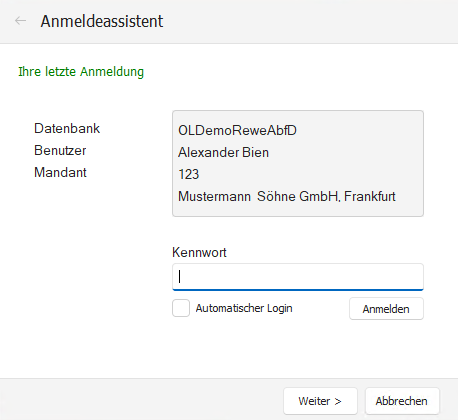 Dabei kannst Du eine andere Datenbank/Mandanten/Benutzer auswählen.