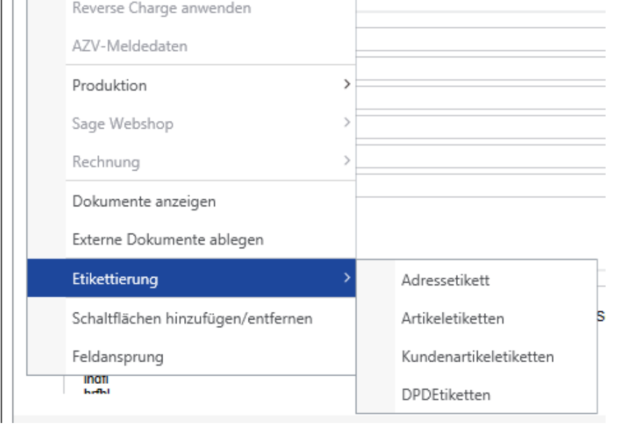 Im Hamburgermenü → Etikettierung → … in der Verkaufsbelegerfassung können Sie unterschiedliche Etikettendrucke anstoßen.