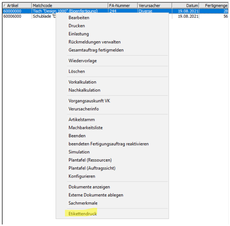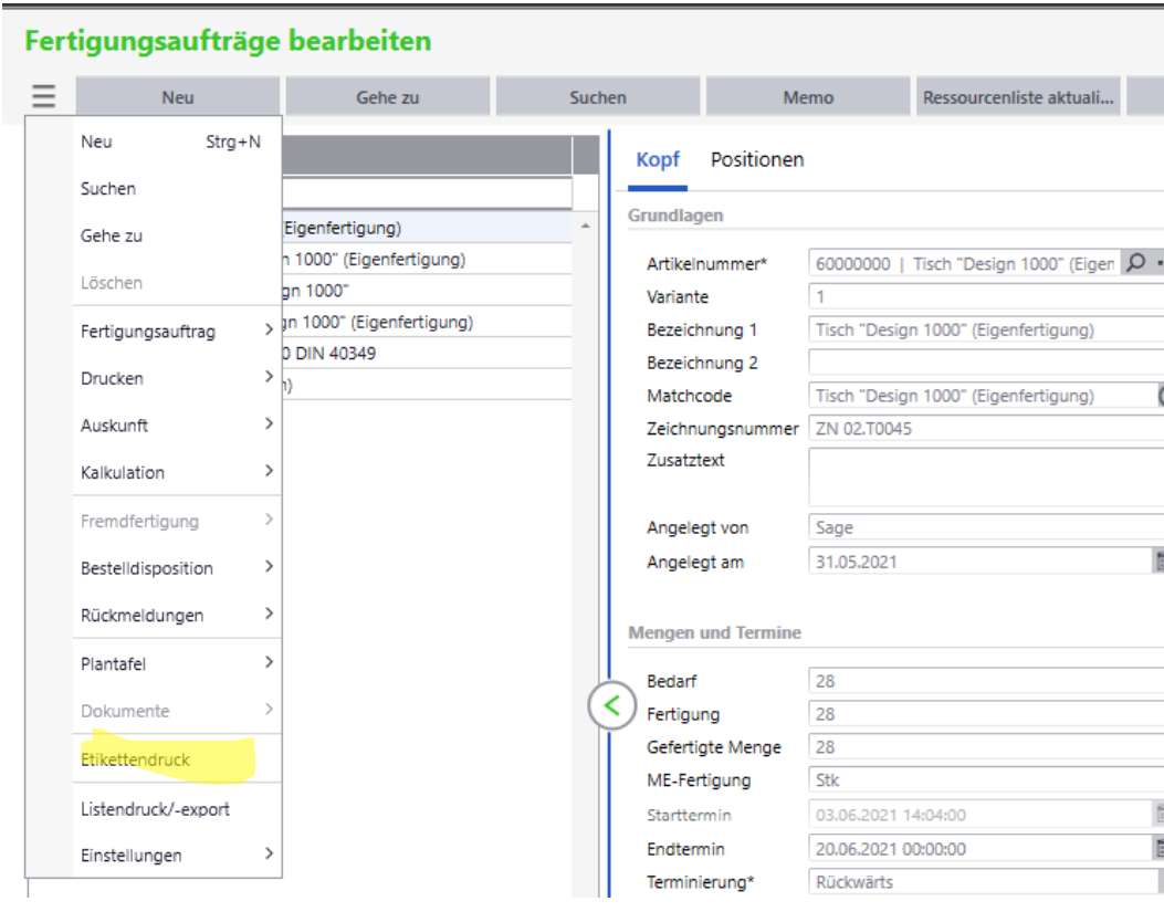 In der Fertigung gibt es zwei Wege Etiketten zu drucken. Die erste Vorgehensweise ist direkt aus dem Formular Fertigungsaufträge bearbeiten. Hat man hier den gewünschten Fertigungsauftrag geladen, kann man über Hamburgermenü → Etikettendruck die Etiketten drucken. Die restliche Vorgehensweise entspricht der beim Wareneingang und bei der Auftragserfassung.