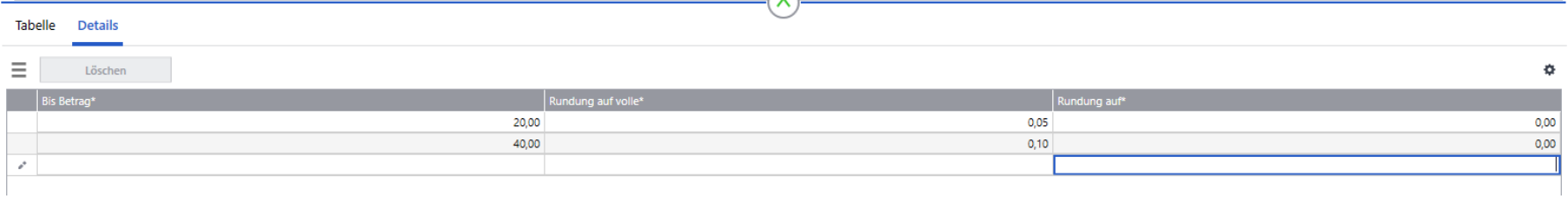 Bis Betrag definiert den Bereich für welchen die Rundungseinstellungen gelten sollen. Werden mehrere Rundungsdetails definiert, ist die Rundungseinstellung zwischen dem Betrag der vorherigen Position der Rundungsdetails und dem definierten Betrag gültig.