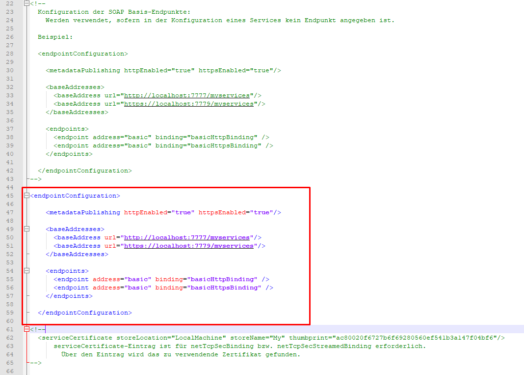 Sofern sich in der Sagede.ApplicationServer.Soap.Config unter C:\Program Files (x86)\Sage\Application Server\9.0 jeglicher XML-Text auskommentiert ist, kannst Du, wie im Screenshot zu sehen, den Endpunkt zwischen dem </endpointConfiguration> & <serviceCertificate> einfügen.