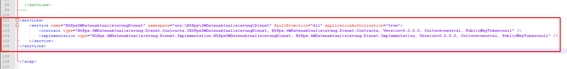 <service name="BSPpsSWDatenaktualisierungDienst" namespace="urn:\BSPps\SWDatenaktualisierung\Dienst" faultPromotion="All" applicationAuthorization="true">