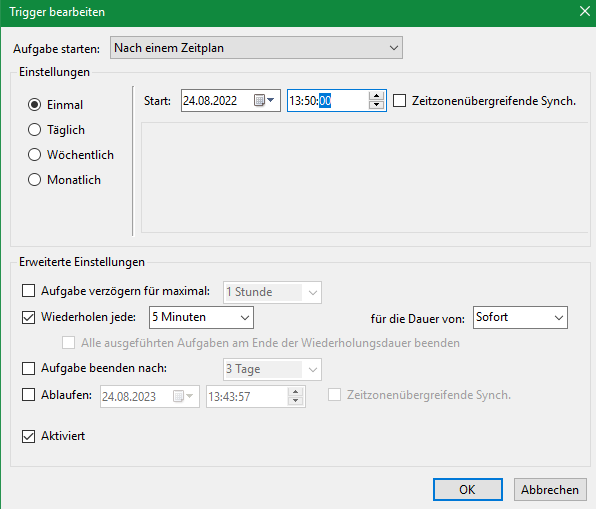 Anschließend wechselst Du in das Register Trigger, konfigurierst pro Aufgabe den Start auf das heutige Datum & wählst eine Uhrzeit in der Zukunft (beispielsweise 5 Minuten in der Zukunft).