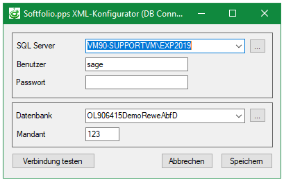 Hierbei werden die Verbindungsparameter (Servername, Datenbank, Benutzer, Passwort in verschlüsselter Form) aus dem Softfolio Cockpit übernommen.
