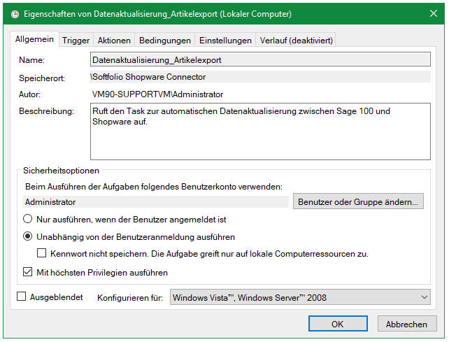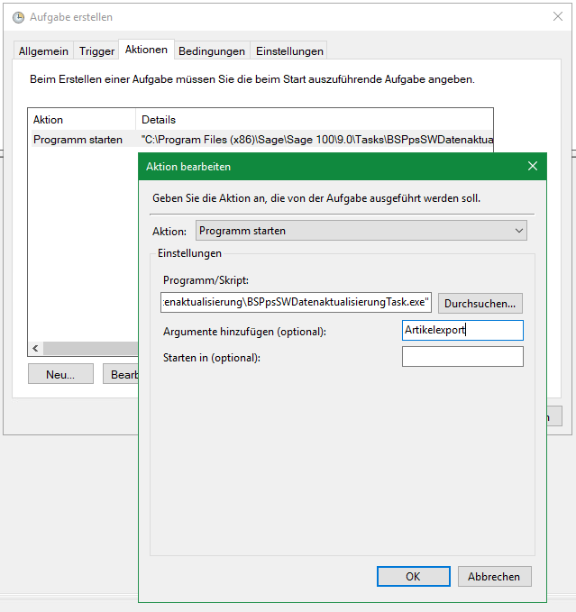 In Aktion überprüfst Du, ob die Aufgabe, auf folgendes Programm verweist C:\Program Files (x86)\Sage\Sage 100\9.0\Tasks\BSPpsSWDatenaktualisierung\BSPpsSWDatenaktualisierungTask.exe.