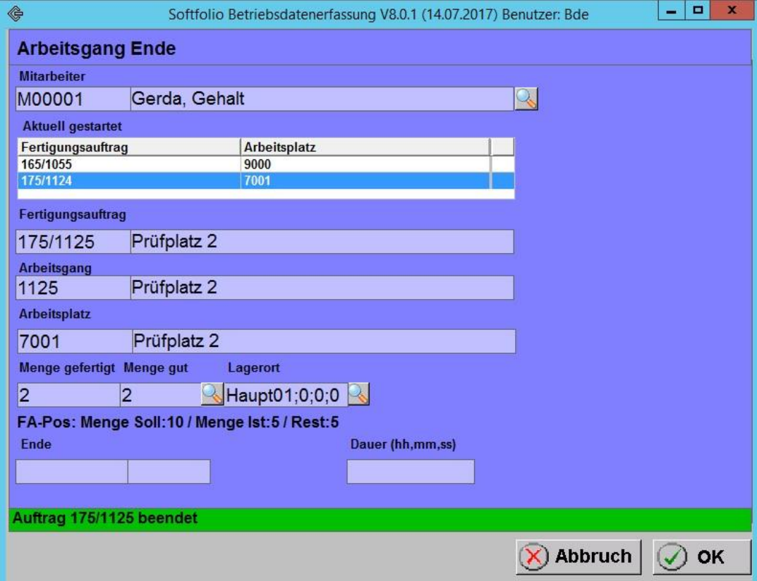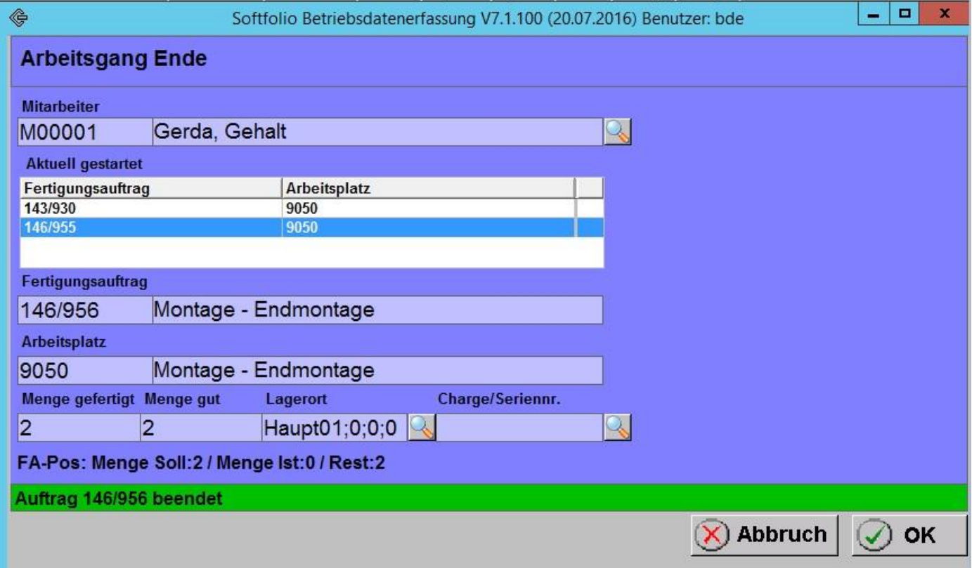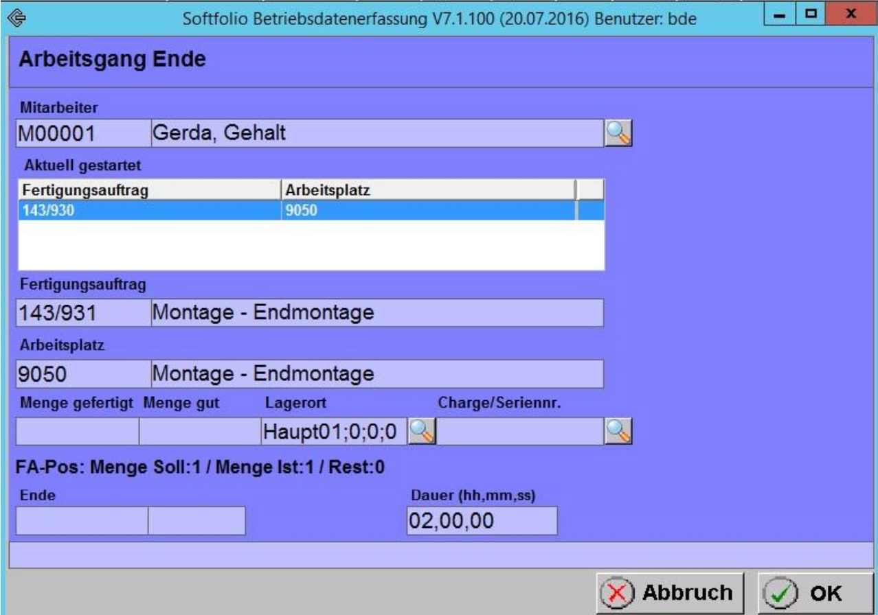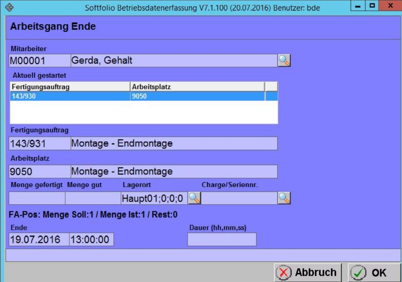 Der Benutzer kann begonnene Fertigungsaufträge mit einer manuellen Endzeitangabe oder einer Zeitdauer beenden. Das Fenster kann durch Ziehen des Randes oder über den Vollbildbutton vergrößert werden.