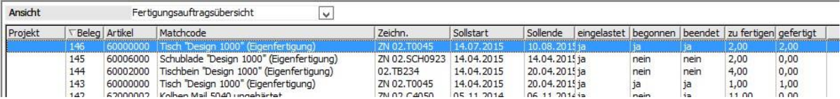 Nun wird nur noch die Arbeitsplatznummer benötigt und der Arbeitsgang für den Fertigungsauftrag kann beendet werden. Nach dem Serverabgleich könnte die Fertigungsauftragsübersicht in der Office Line folgendermaßen aussehen: