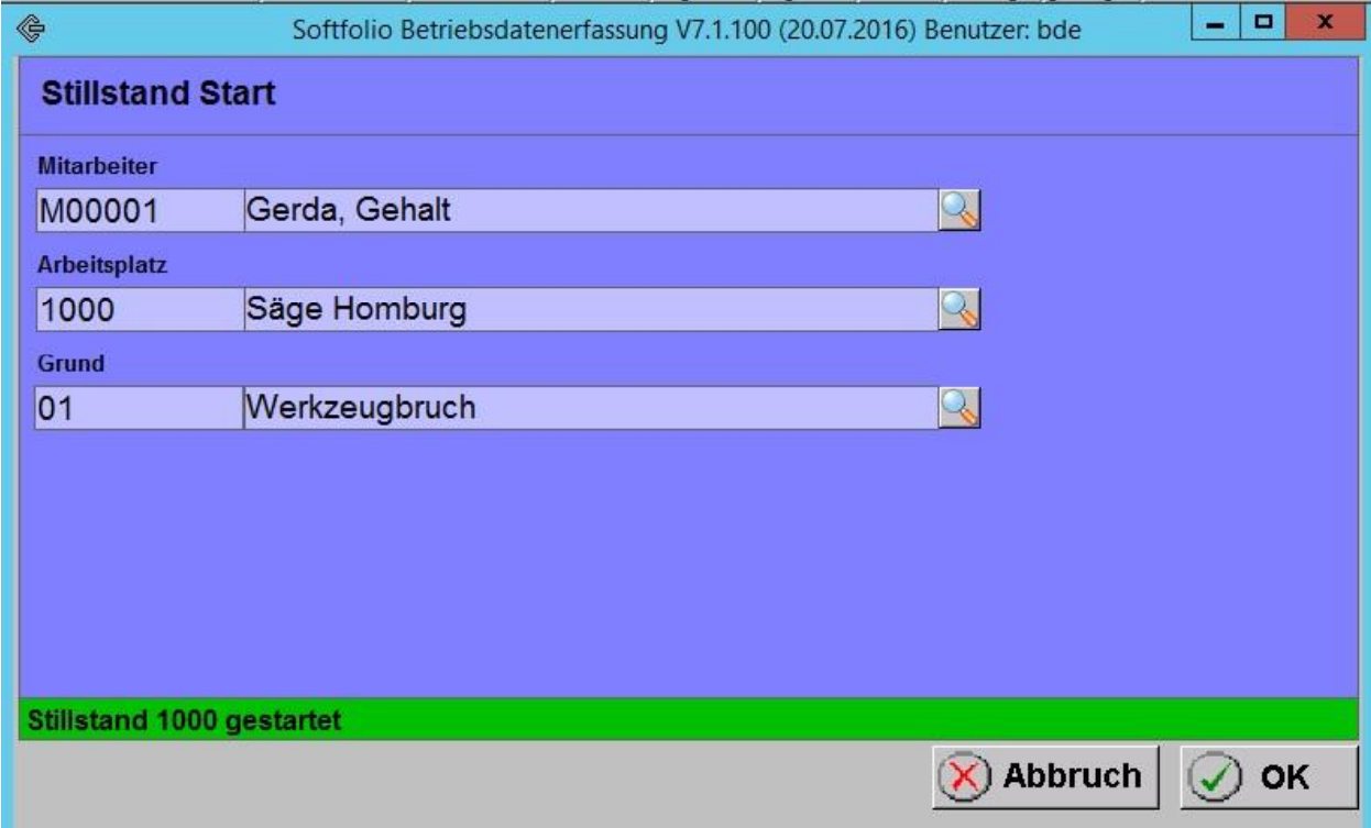 Mithilfe dieses Stempels können Sie den Start eines Stillstandes an einem Arbeitsplatz bestimmen. Hierzu wird eine Mitarbeiternummer des jeweiligen Mitarbeiters benötigt, der anwesend bzw. angemeldet sein muss. Die Arbeitsplatznummer wird zusätzlich noch benötigt und die Stillstandsbegründungen müssen angelegt sein. (Produktion → Stammdaten → Stillstandsbegründungen)