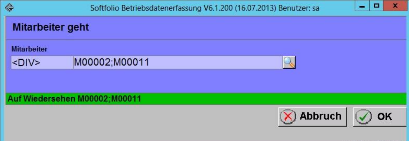 Sie haben auch die Möglichkeit mehrere Mitarbeiter gleichzeitig als abwesend zu stempeln. Nach der Eingabe der Mitarbeiternummer öffnet sich ein Fenster, in dem mehrere Mitarbeiternummern eingetragen werden können.